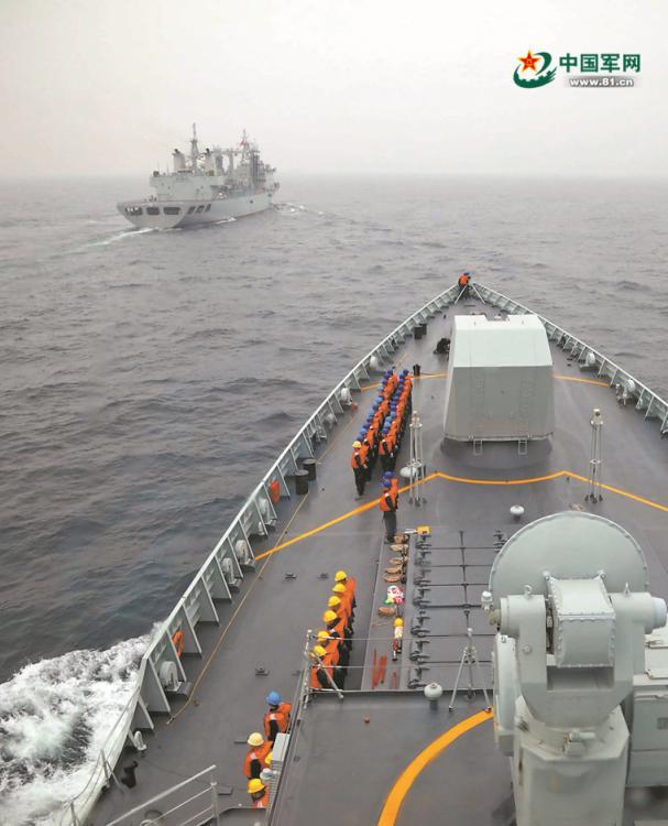 东海某海域,绵绵阴雨中,东部战区海军某驱逐舰支队舰艇编队展开一场实战化攻防演练。警报拉响,太原舰作战指挥室各战位号手紧张忙碌,电子海图和雷达屏幕上目标参数变换闪烁。当显示“敌”舰的黄点突然出现在屏幕上时,官兵精神高度集中。“攻击,左舷齐射……”炮声隆隆,海面腾起一团火焰。图为航行补给占位训练。温子东 李宇 摄影报道