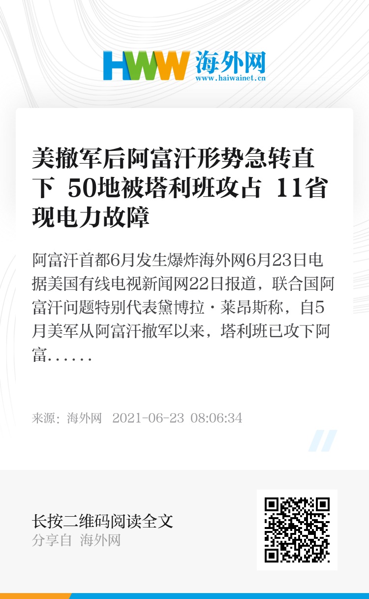 海外网6月23日电 据美国有线电视新闻网22日报道,联合国阿富汗问题特别代表黛博拉·莱昂斯称,自5月美军从阿富汗撤军以来,塔利班已攻下阿富汗50个地区。这些地区占阿富汗地区的近七分之一。