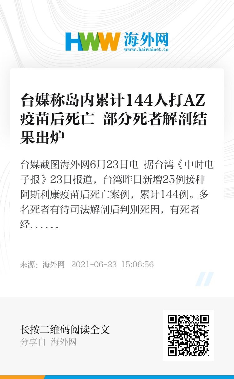海外网6月23日电 据台湾《中时电子报》23日报道,台湾昨日新增25例接种阿斯利康疫苗后死亡案例,累计144例。多名死者有待司法解剖后判别死因,有死者经解剖后发现有本身潜在疾病。