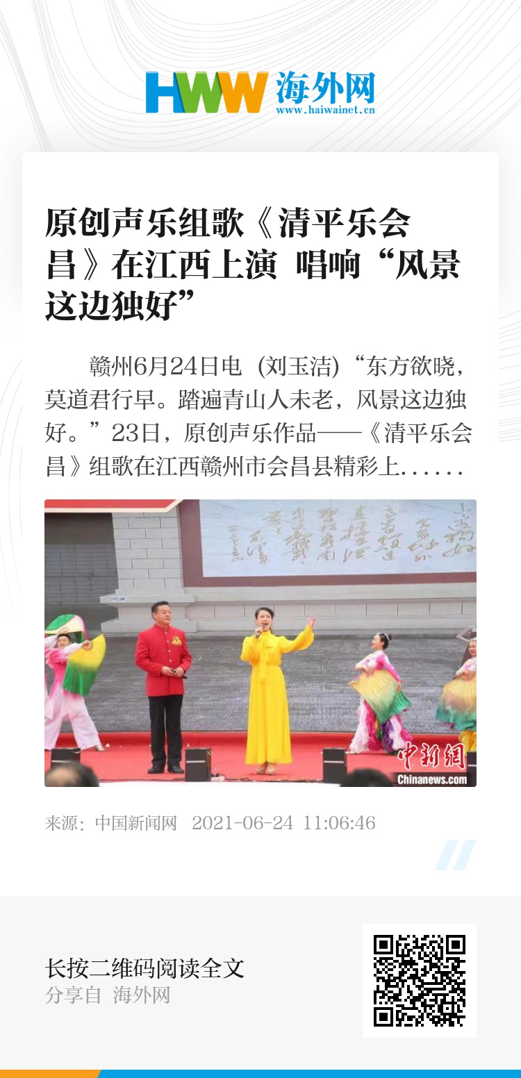 中新网赣州6月24日电 (刘玉洁)“东方欲晓,莫道君行早。踏遍青山人未老,风景这边独好。”23日,原创声乐作品——《清平乐会昌》组歌在江西赣州市会昌县精彩上演。
