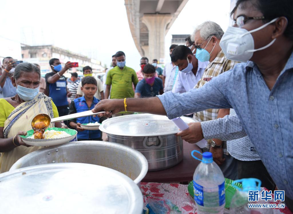 6月23日,志愿者在印度阿加尔塔拉封锁期间为人们分发食物。  新华社发