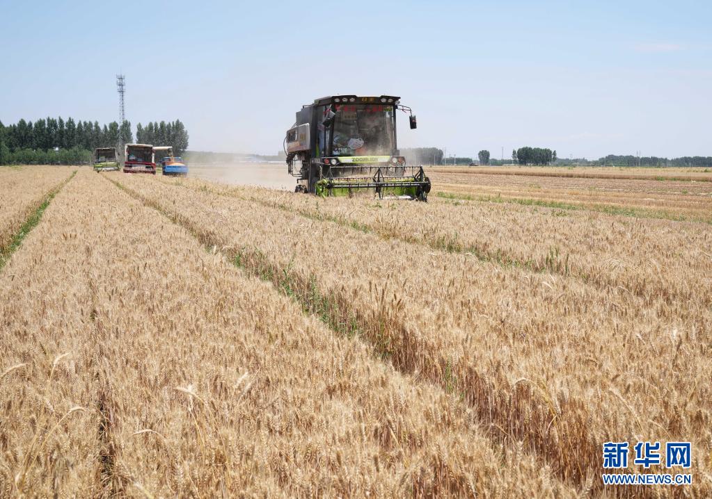 6月22日,联合收割机在河北省唐山市滦南县长凝镇方泡村田间收割小麦。今年我国夏粮再获丰收,为全年粮食产量保持在1.3万亿斤以上打下坚实基础,为经济社会发展大局提供有力支撑。新华社记者 杨世尧 摄