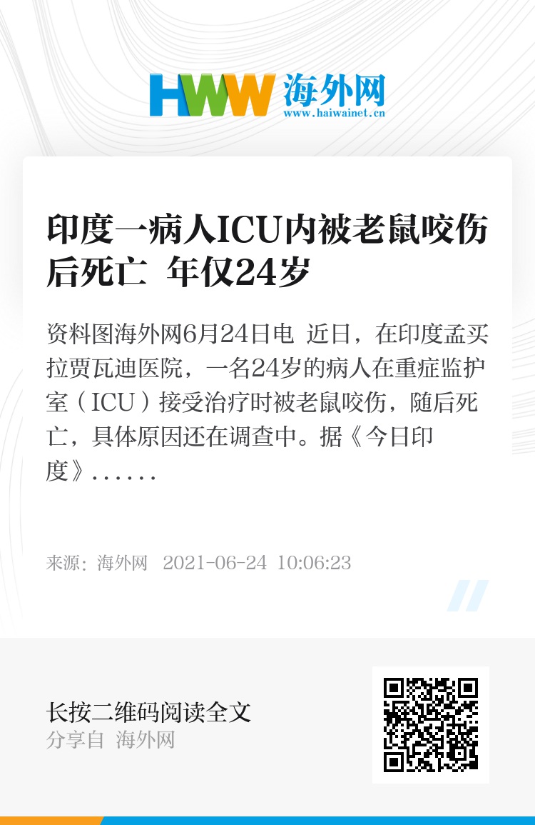 海外网6月24日电 近日,在印度孟买拉贾瓦迪医院,一名24岁的病人在重症监护室(ICU)接受治疗时被老鼠咬伤,随后死亡,具体原因还在调查中。