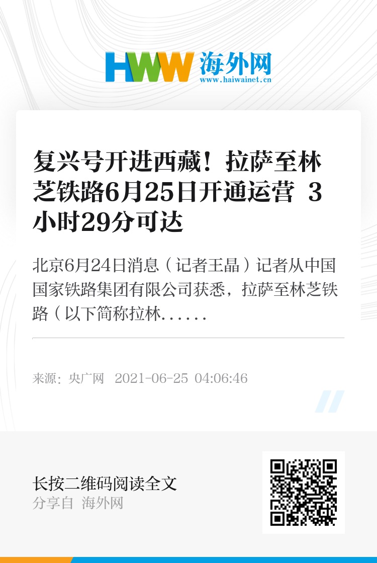 央广网北京6月24日消息(记者王晶)记者从中国国家铁路集团有限公司获悉,拉萨至林芝铁路(以下简称拉林铁路)将于6月25日开通运营,复兴号高原内电双源动车组同步投入运营,拉萨至山南、林芝最快1小时10分、3小时29分可达。