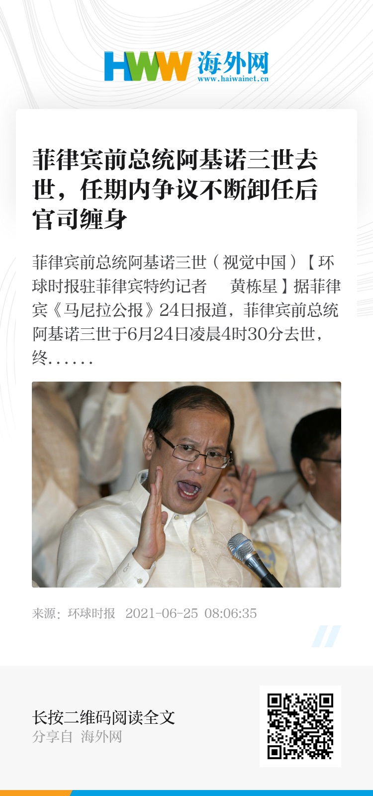 【环球时报驻菲律宾特约记者 黄栋星】据菲律宾《马尼拉公报》24日报道,菲律宾前总统阿基诺三世于6月24日凌晨4时30分去世,终年61岁。阿基诺三世出生于菲律宾政治世家阿基诺家族,他的父亲是菲已故参议员阿基诺二世,母亲是菲已故前总统科拉松·阿基诺夫人。头顶家族政治光环,阿基诺三世顺遂地走上了政治道路,并于2010年至2016年担任菲第15任总统。不过,阿基诺三世任内遭遇多次危机,曾制造“南海仲裁”闹剧,导致菲律宾和中国关系一度跌入谷底。阿基诺三世在卸任后还遭到刑事指控。