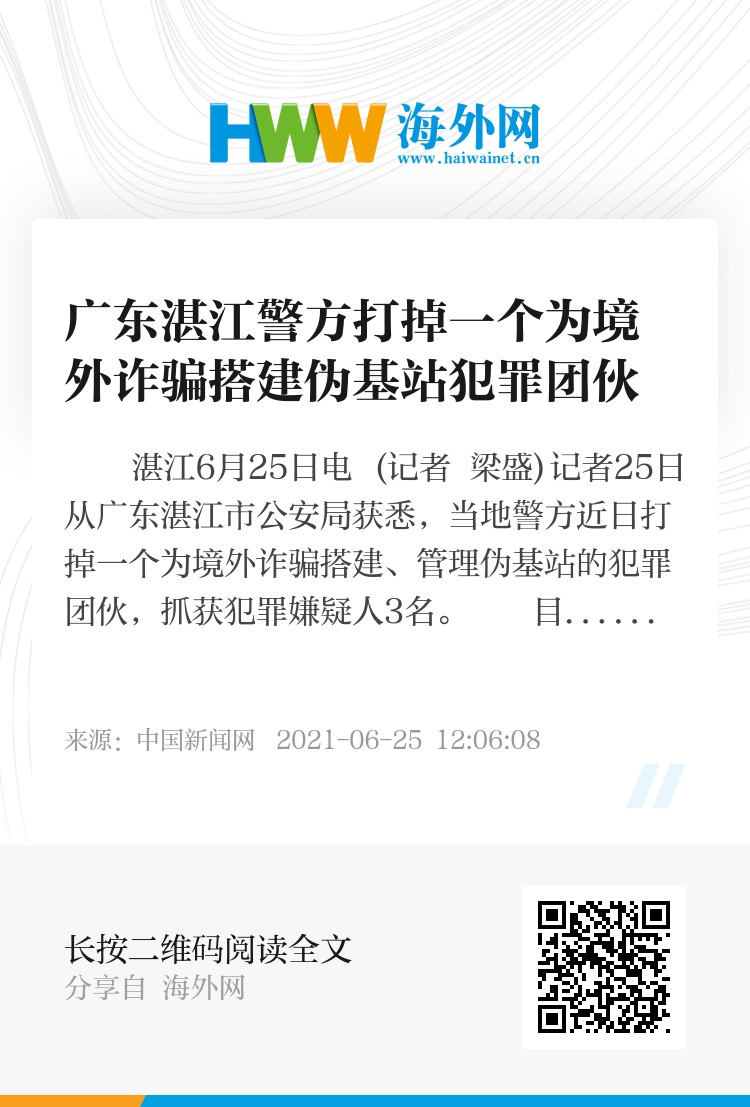 中新网湛江6月25日电 (记者 梁盛)记者25日从广东湛江市公安局获悉,当地警方近日打掉一个为境外诈骗搭建、管理伪基站的犯罪团伙,抓获犯罪嫌疑人3名。