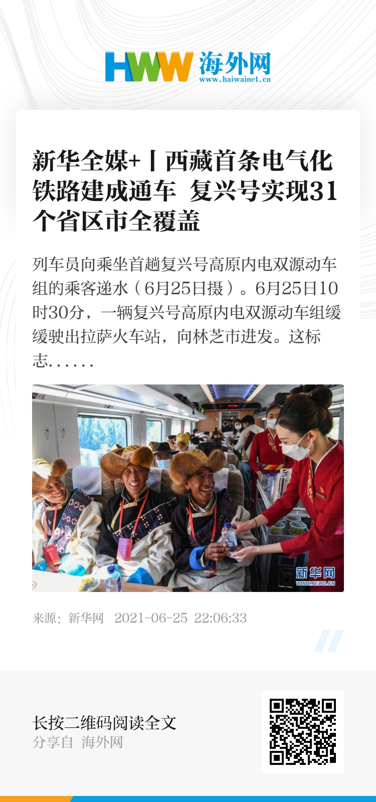 6月25日10时30分,一辆复兴号高原内电双源动车组缓缓驶出拉萨火车站,向林芝市进发。这标志着全长435公里、设计时速160公里的拉林铁路建成通车,西藏首条电气化铁路建成,同时复兴号实现对31个省区市全覆盖。