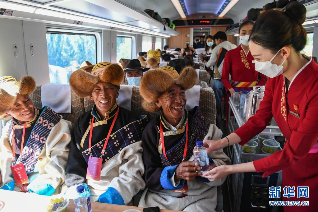 列车员向乘坐首趟复兴号高原内电双源动车组的乘客递水(6月25日摄)。