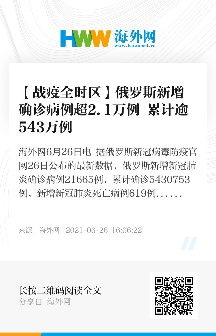海外网6月26日电 据俄罗斯新冠病毒防疫官网26日公布的最新数据,俄罗斯新增新冠肺炎确诊病例21665例,累计确诊5430753例,新增新冠肺炎死亡病例619例,累计死亡132683例。(海外网 赵健行)