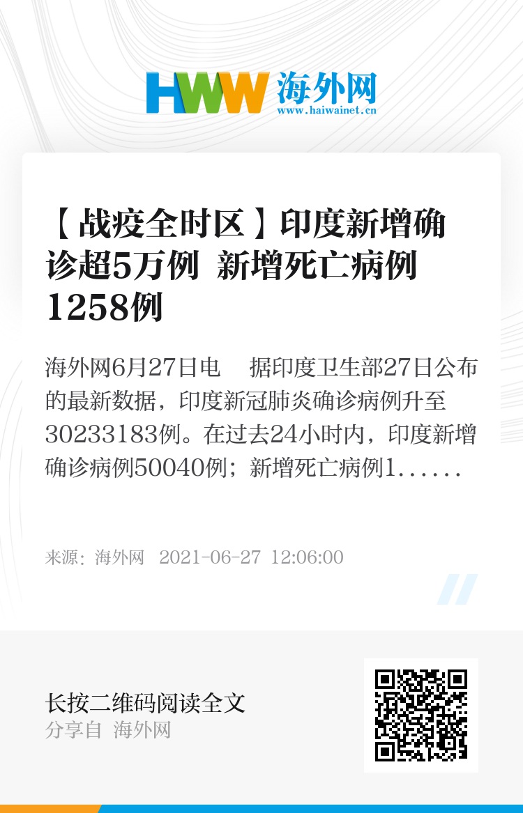 海外网6月27日电 据印度卫生部27日公布的最新数据,印度新冠肺炎确诊病例升至30233183例。在过去24小时内,印度新增确诊病例50040例;新增死亡病例1258例,累计死亡病例达395751例。(海外网 李芳)