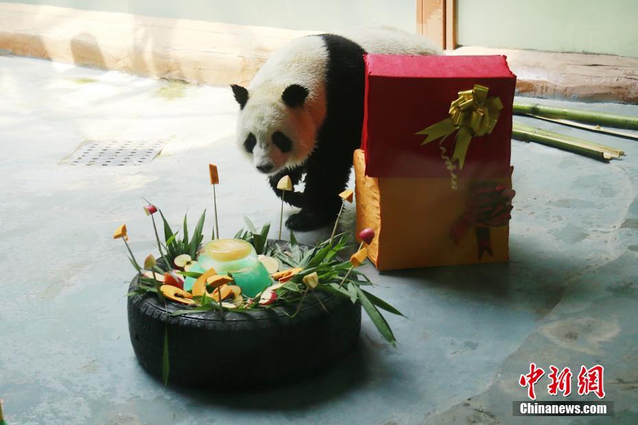 6月27日,在青海西宁熊猫馆内,大熊猫“园满”来到为它准备的生日蛋糕和礼物旁。当日,大熊猫姐妹“奇果”和“园满”在西宁熊猫馆迎来5岁生日。园方为他们特制蛋糕庆祝。 中新社记者 马铭言 摄