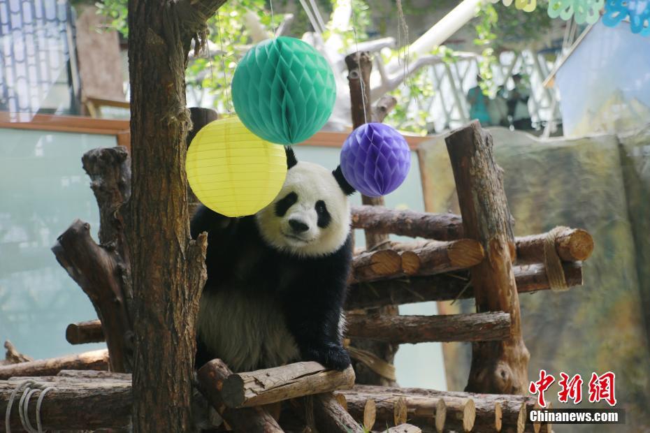 6月27日,在青海西宁熊猫馆内,大熊猫“园满”在木桥上玩耍卖萌。当日,大熊猫姐妹“奇果”和“园满”在西宁熊猫馆迎来5岁生日。园方为他们特制蛋糕庆祝。 中新社记者 马铭言 摄