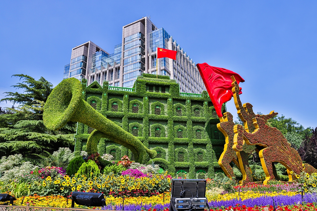 6月27日,为庆祝中国共产党成立100周年,北京长安街沿线10组主题立体花坛近日相继亮相。从建国门至复兴门,10组花坛依次讲述了“开天辟地”、“建军大业”、“建国伟业”、“人民至上”、“全面小康”、“创新发展”、“美丽中国”、“扬帆起航”、“走向世界”、“改革开放”的非凡故事。图片来源:人民视觉