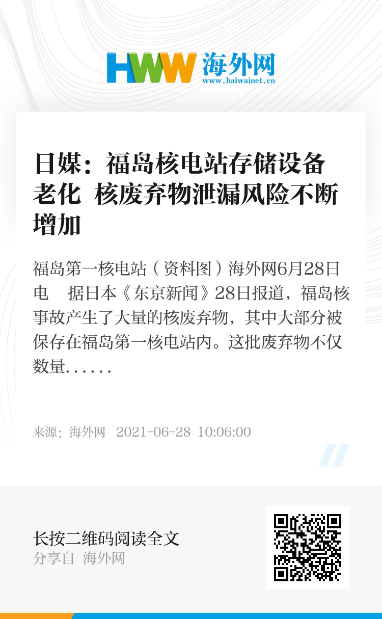 海外网6月28日电 据日本《东京新闻》28日报道,福岛核事故产生了大量的核废弃物,其中大部分被保存在福岛第一核电站内。这批废弃物不仅数量庞大、种类繁多,存储设备也在不断老化,其泄漏风险在不断增大。
