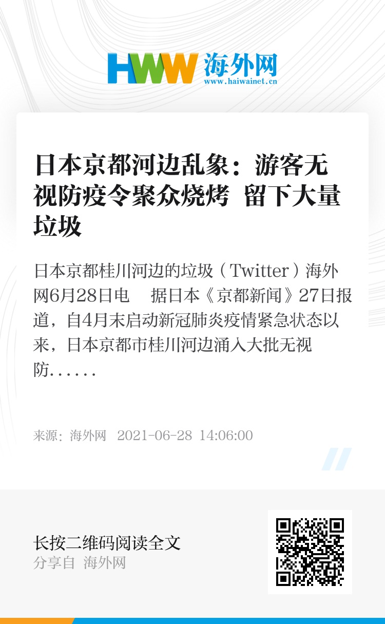 淀川河川管理局负责人表示,京都的紧急状态虽然已经解除,但管理局仍在犹豫是否开放河岸,“希望大家拒绝不文明行为,努力保护河川环境”。(海外网 王西洛)
