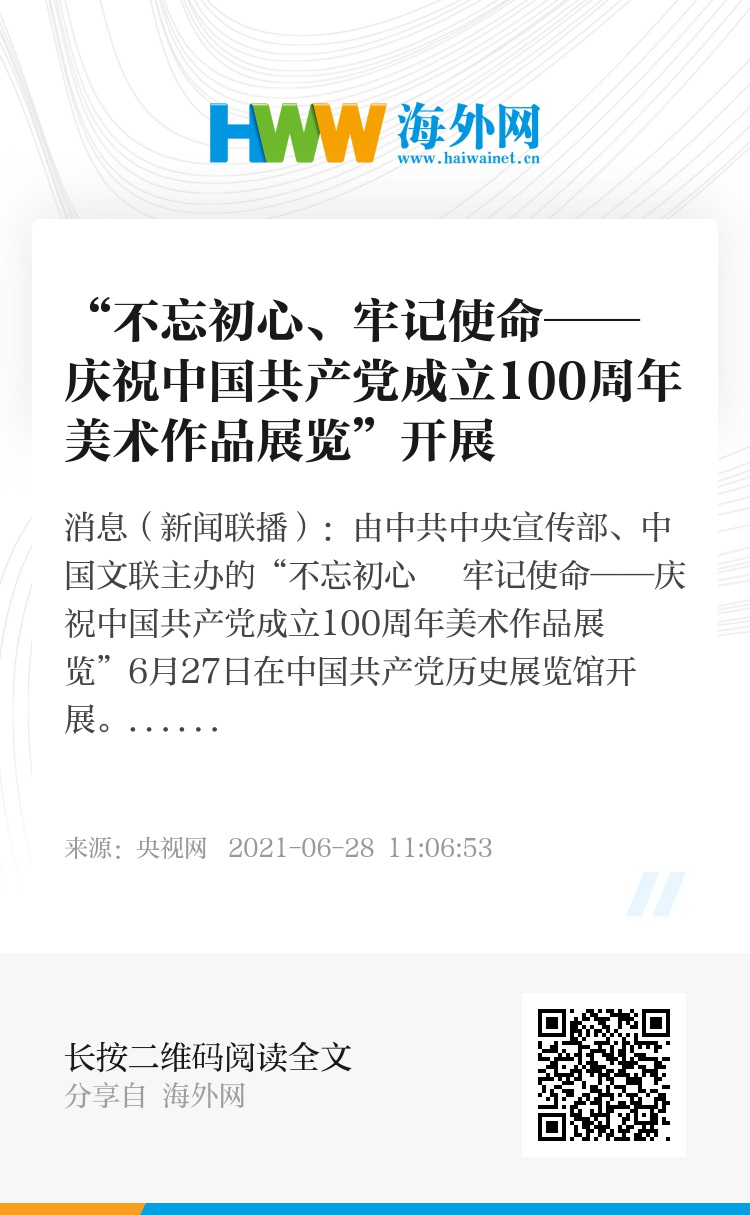 央视网消息(新闻联播):由中共中央宣传部、中国文联主办的“不忘初心 牢记使命——庆祝中国共产党成立100周年美术作品展览”6月27日在中国共产党历史展览馆开展。展览聚焦建党百年的重大历史事件、杰出历史人物和优秀共产党人,形象化地再现了中国共产党的光辉历程和不朽功勋,以艺术之美诠释了在党的领导下中华民族实现了从站起来、富起来到强起来的历史性飞跃,以时代画卷描绘了中国人民阔步新征程、奋进新时代,实现中华民族伟大复兴的光明前景。