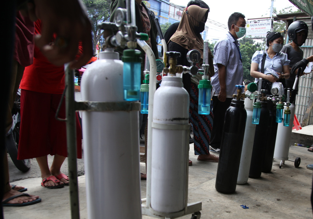 印尼新冠疫情严峻 民众排队为氧气瓶充氧