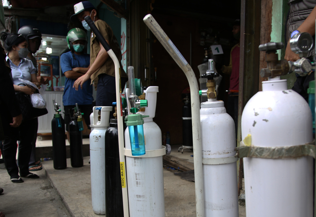 当地时间2021年6月28日,印尼雅加达,新冠疫情严峻,民众排队为氧气瓶充氧。图源:澎湃影像