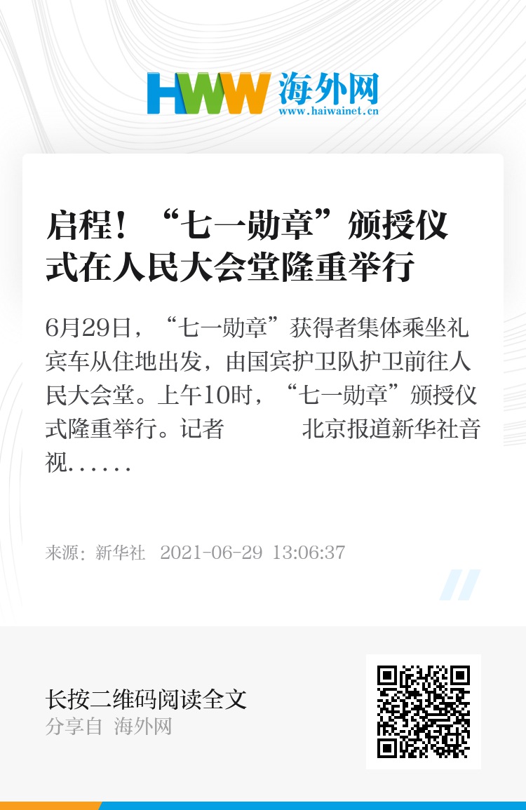 6月29日,“七一勋章”获得者集体乘坐礼宾车从住地出发,由国宾护卫队护卫前往人民大会堂。上午10时,“七一勋章”颁授仪式隆重举行。