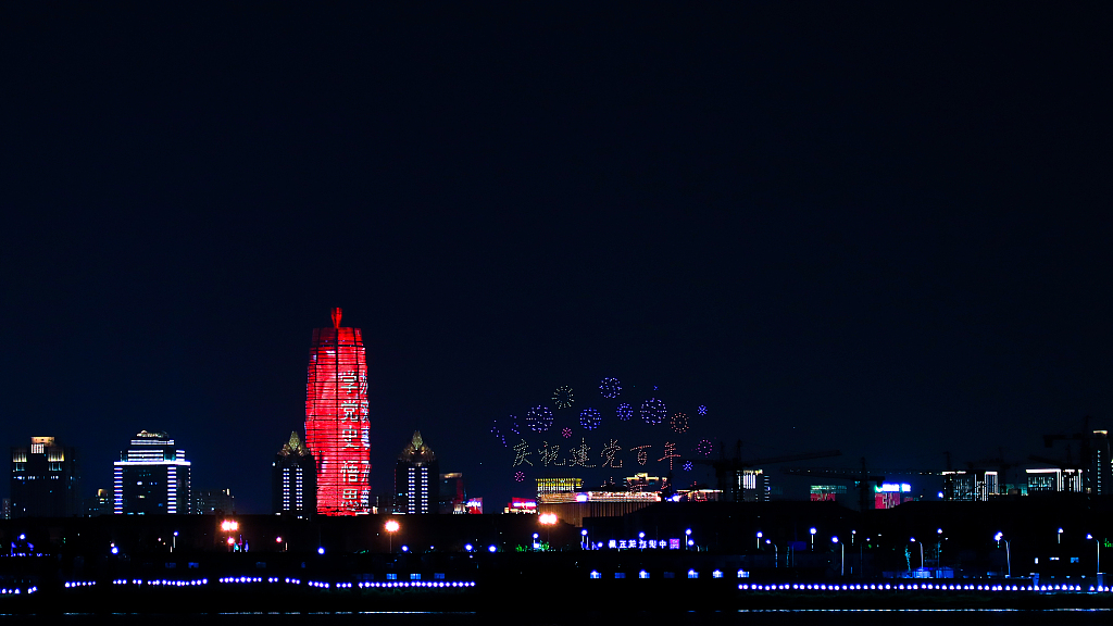 2021年6月28日,郑州市郑东新区上演无人机秀,庆祝建党百年。图源:人民视觉