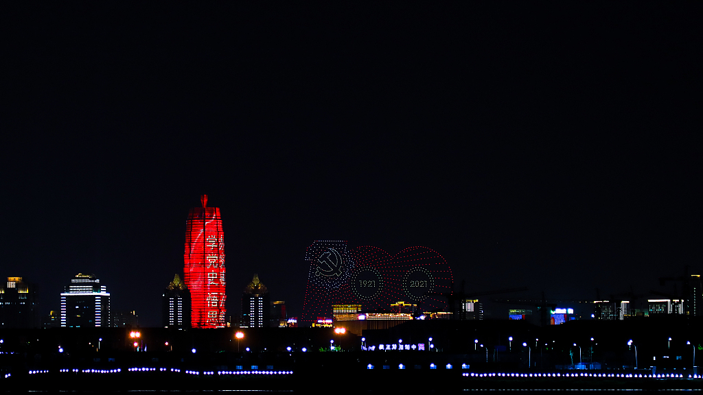 2021年6月28日,郑州市郑东新区上演无人机秀,庆祝建党百年。图源:人民视觉