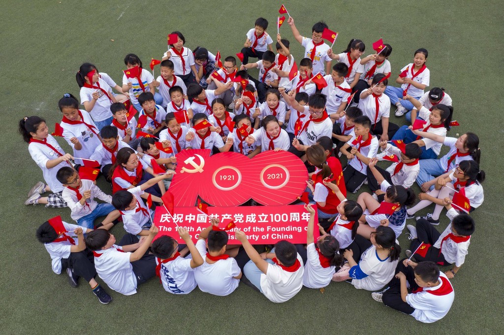 2021年6月30日,江苏省泰州市大冯中心小学学生手挥党旗庆祝党的100岁生日。 当日,江苏省泰州市大冯中心小学开展“童心向党 献礼百年华诞”主题班会。通过给学生上党课、讲党史等方式,传承红色基因,让学生了解党的光辉历程,庆祝中国共产党成立100周年。图源:IC photo