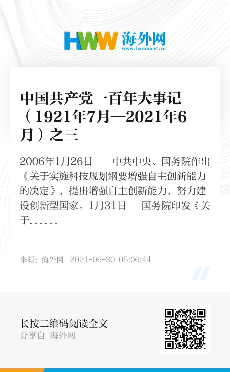 1月26日 中共中央、国务院作出《关于实施科技规划纲要增强自主创新能力的决定》,提出增强自主创新能力,努力建设创新型国家。
