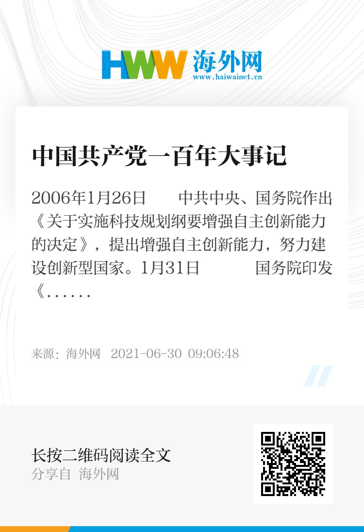1月26日 中共中央、国务院作出《关于实施科技规划纲要增强自主创新能力的决定》,提出增强自主创新能力,努力建设创新型国家。