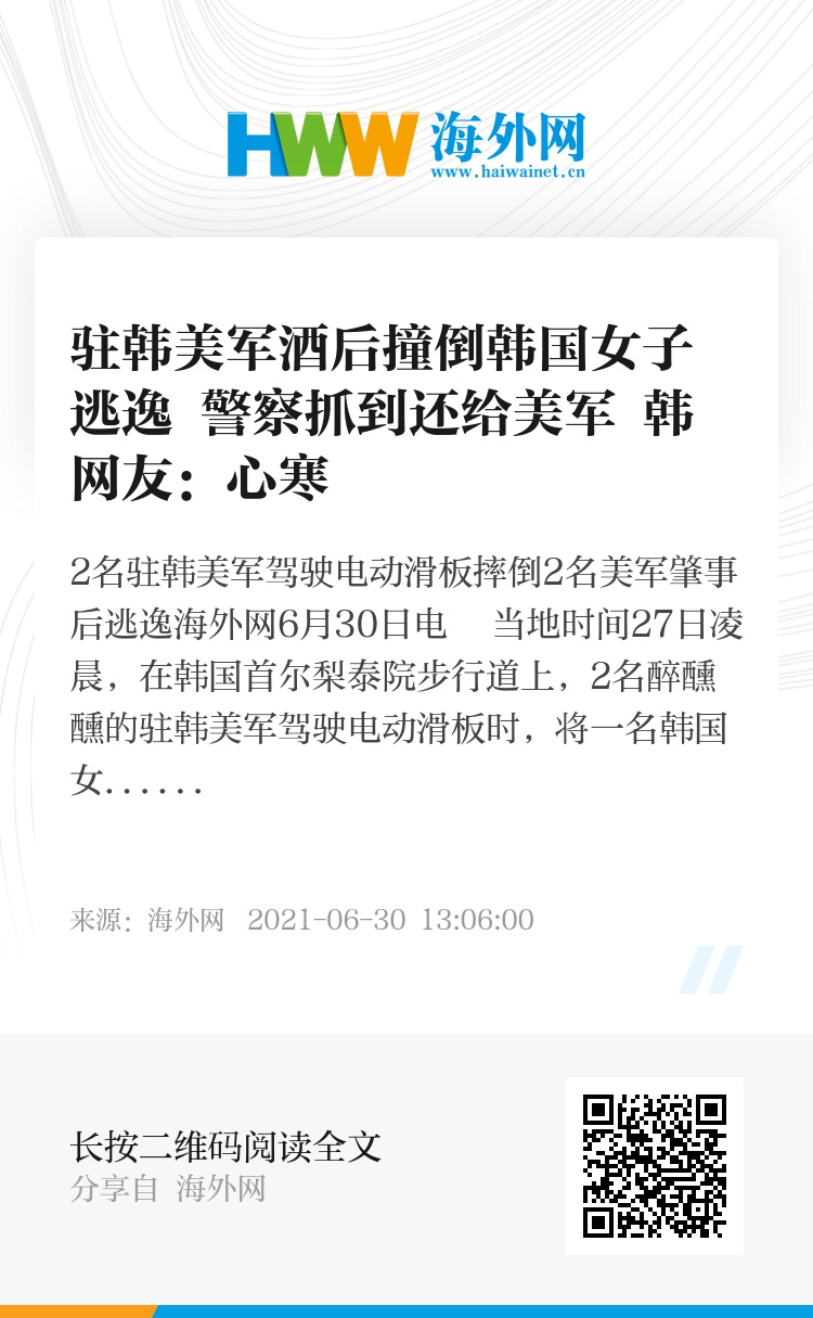 海外网6月30日电 当地时间27日凌晨,在韩国首尔梨泰院步行道上,2名醉醺醺的驻韩美军驾驶电动滑板时,将一名韩国女子撞倒在地。两人逃逸后,遭警方当场逮捕,但未受惩罚就被移交给美军。此事引发韩国舆论不满,有网友吐槽,“大韩民国真像美国附属国!”。