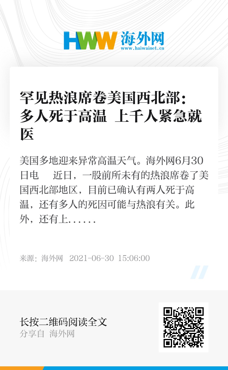 海外网6月30日电 近日,一股前所未有的热浪席卷了美国西北部地区,目前已确认有两人死于高温,还有多人的死因可能与热浪有关。此外,还有上千人因高温导致的身体不适和疾病而紧急就医。