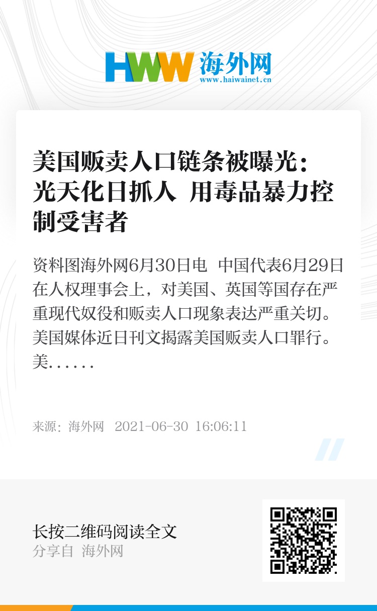 海外网6月30日电 中国代表6月29日在人权理事会上,对美国、英国等国存在严重现代奴役和贩卖人口现象表达严重关切。美国媒体近日刊文揭露美国贩卖人口罪行。