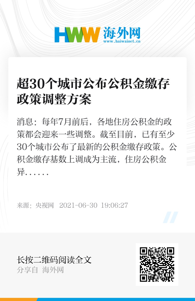 央视网消息:每年7月前后,各地住房公积金的政策都会迎来一些调整。截至目前,已有至少30个城市公布了最新的公积金缴存政策。公积金缴存基数上调成为主流,住房公积金异地“互认互贷”也有了新进展。