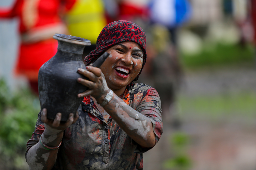 尼泊尔庆祝国家水稻日 民众互泼泥浆祈盼风调雨顺