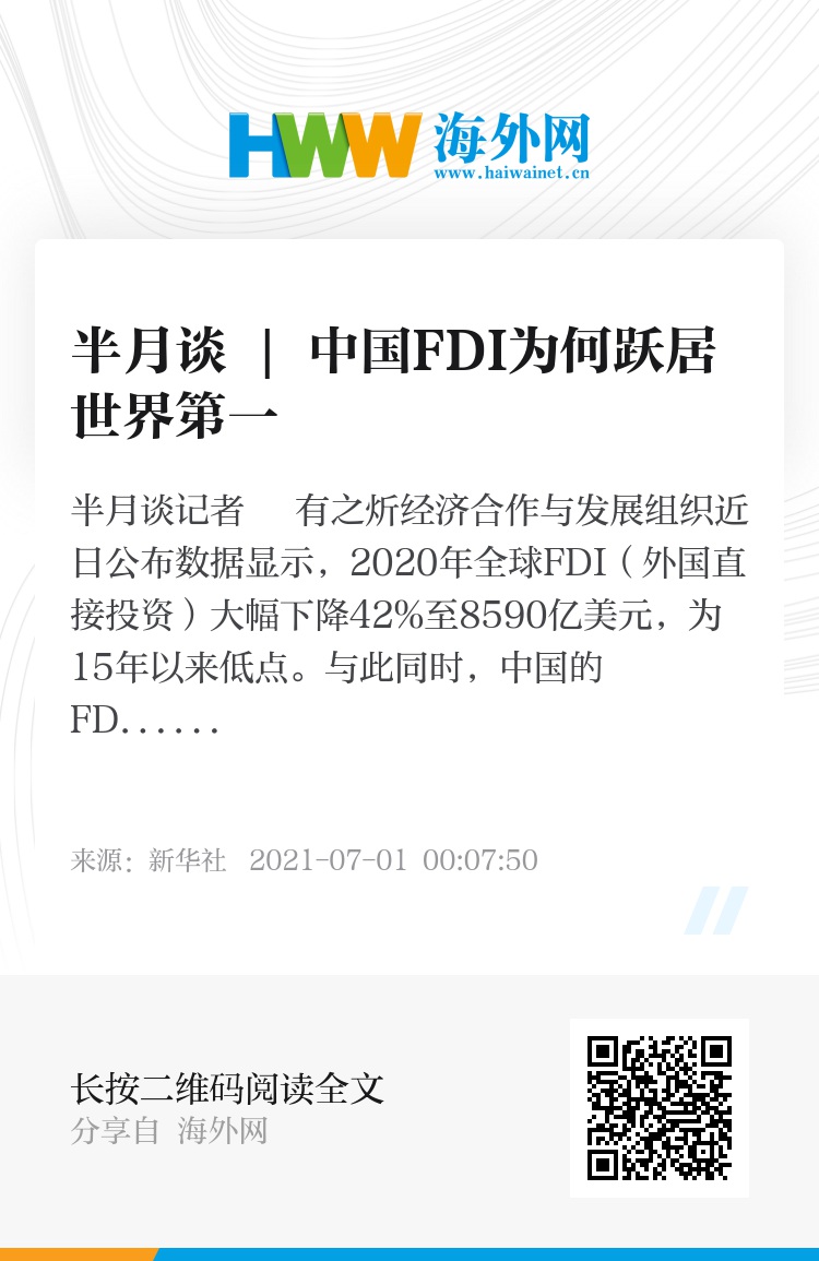 经济合作与发展组织近日公布数据显示,2020年全球FDI(外国直接投资)大幅下降42%至8590亿美元,为15年以来低点。与此同时,中国的FDI逆势上扬,达到1630亿美元,首次超越美国成为世界第一大外资流入国。中国FDI为何跃居世界第一?