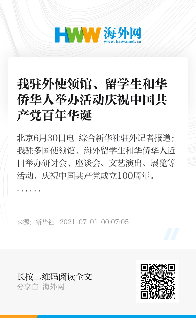 新华社北京6月30日电 综合新华社驻外记者报道:我驻多国使领馆、海外留学生和华侨华人近日举办研讨会、座谈会、文艺演出、展览等活动,庆祝中国共产党成立100周年。
