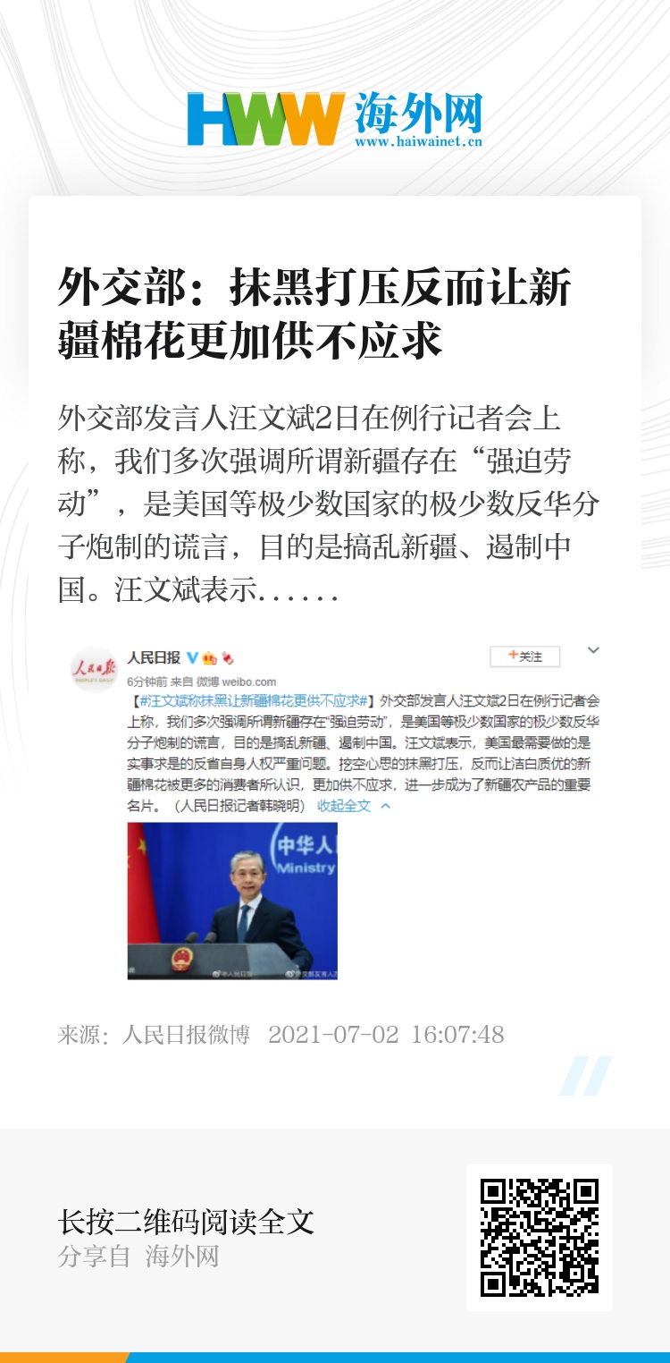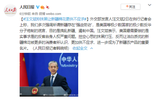 外交部发言人汪文斌2日在例行记者会上称,我们多次强调所谓新疆存在“强迫劳动”,是美国等极少数国家的极少数反华分子炮制的谎言,目的是搞乱新疆、遏制中国。汪文斌表示,美国最需要做的是实事求是的反省自身人权严重问题。挖空心思的抹黑打压,反而让洁白质优的新疆棉花被更多的消费者所认识,更加供不应求,进一步成为了新疆农产品的重要名片。(人民日报记者韩晓明)