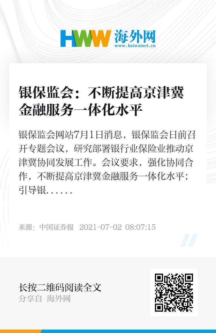 银保监会网站7月1日消息,银保监会日前召开专题会议,研究部署银行业保险业推动京津冀协同发展工作。会议要求,强化协同合作,不断提高京津冀金融服务一体化水平;引导银行保险机构持续加大交通、生态、产业升级、冬奥等重点领域金融支持。