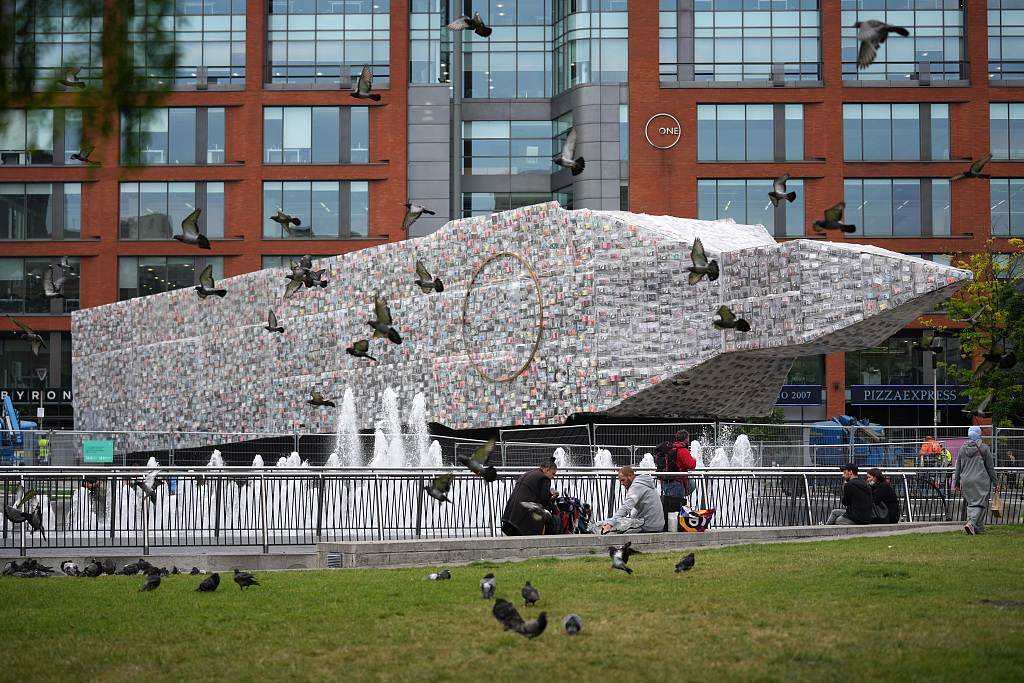 ​位于英国曼彻斯特皮卡迪利花园的“躺着的大本钟”于7月1日正式开放,这属于曼彻斯特国际艺术节活动的一部分。该作品由阿根廷艺术家Marta创作。图片来源:视觉中国