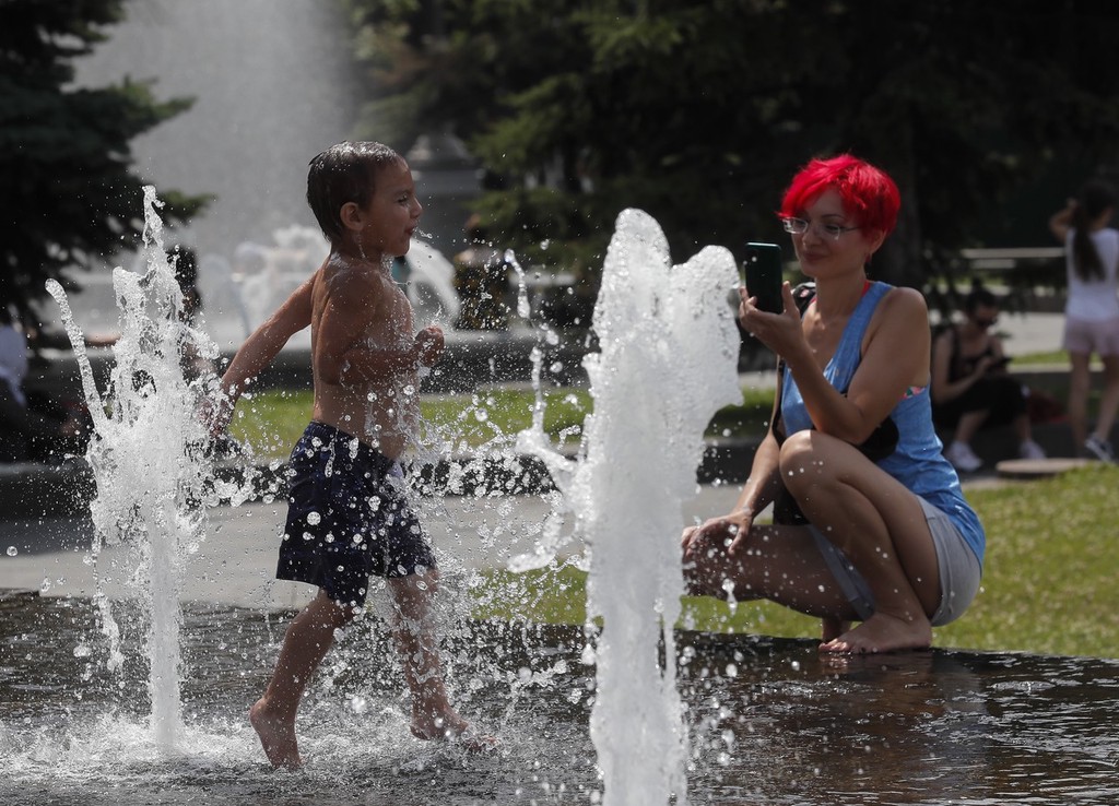 乌克兰基辅天气炎热 儿童喷泉处降温消暑
