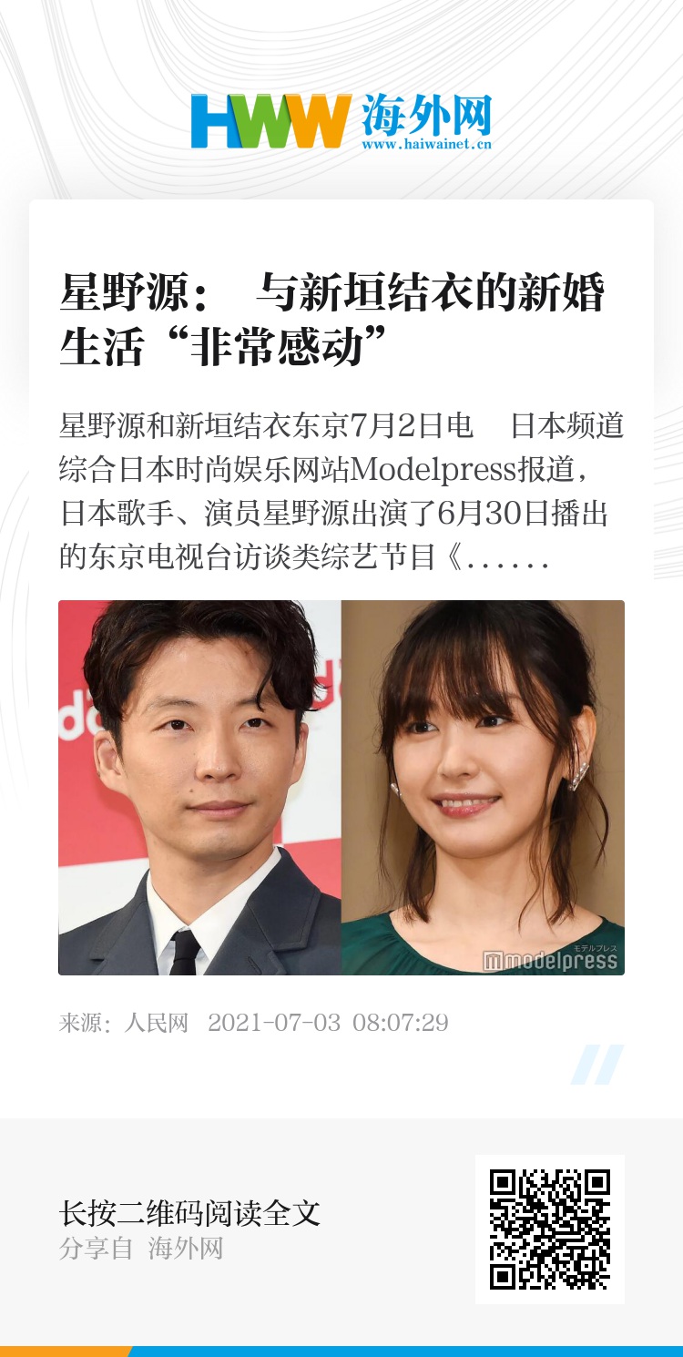 人民网东京7月2日电 日本频道综合日本时尚娱乐网站Modelpress报道,日本歌手、演员星野源出演了6月30日播出的东京电视台访谈类综艺节目《这里那里奥黛丽》,大谈与妻子的新婚生活。今年5月,星野源与新垣结衣官宣结婚,引起广泛关注。