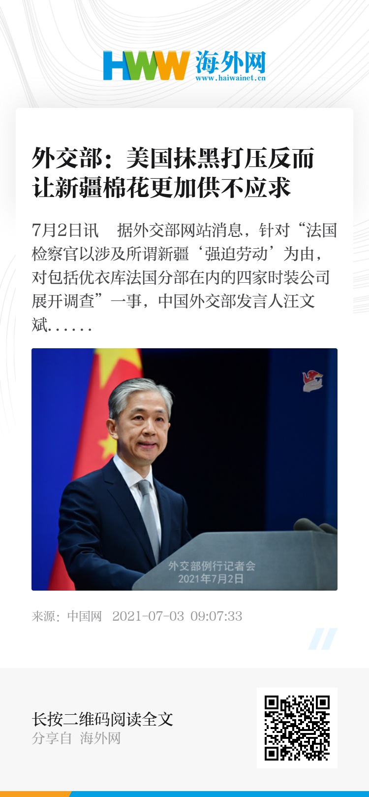 “我还想告诉大家的是,挖空心思的抹黑打压反而让洁白质优的新疆棉花被更多消费者所认识,更加供不应求,进一步成为了新疆农产品的重要名片。”汪文斌说。