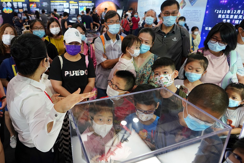 7月2日,“时代精神耀香江”之百年中国科学家主题展暂停两天后重新向公众开放,众多市民踊跃前来参观主题展。图为众多小朋友前来参观展览。 中新社记者 张炜 摄