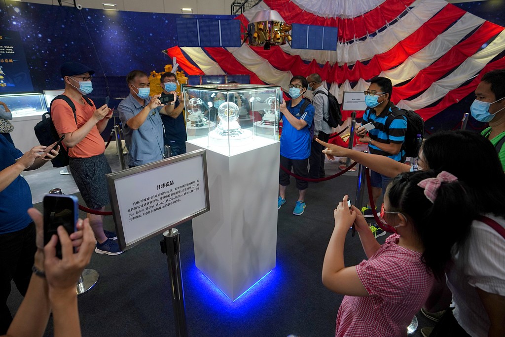 7月2日,“时代精神耀香江”之百年中国科学家主题展暂停两天后重新向公众开放,众多市民踊跃前来参观主题展。 其中月球样品(月壤)仍旧是展览的“明星”。为防止人群聚集,观众须分批限时参观。图为众多市民参观月壤。 中新社记者 张炜 摄