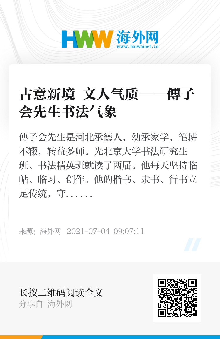 傅子会先生是河北承德人,幼承家学,笔耕不辍,转益多师。光北京大学书法研究生班、书法精英班就读了两届。他每天坚持临帖、临习、创作。他的楷书、隶书、行书立足传统,守正创新,有底蕴,有新意,有自己的风貌。他的作品被众多的艺术机构和藏家收藏。尤其是河北承德避暑山庄七十二景,到处都有他的墨宝,承德普陀宗乘之庙有他组织的康熙、乾隆百寿系列展。他为人低调、谦和,又不失幽默,正因为他低调,媒体上对他的宣传不多。因为他对书法事业的热爱,不是为了追名逐利。他热心公益事业,多次义捐、义卖作品,造福百姓,服务他人。他始终明白书法“为何写、为谁写、写什么、怎么写?”的艺术之道,所以,他的书法无论内行、外行,无论职业书家还是业余书家,都能充分接受,一致赞誉,可谓雅俗共赏,很接地气,各阶层人士都喜欢。