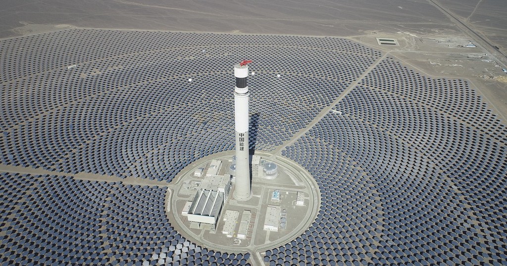 2021年7月3日,新疆伊吾淖毛湖镇,哈密50兆瓦熔盐塔式光热发电是国家首批太阳能热发电示范项目,也是新疆首个光热发电示范项目。图片来源:IC photo