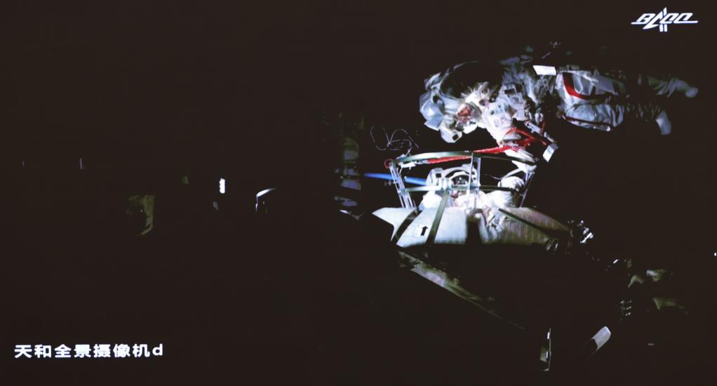 7月4日,在北京航天飞行控制中心大屏拍摄的两名航天员在舱外工作场面。新华社记者 金立旺 摄