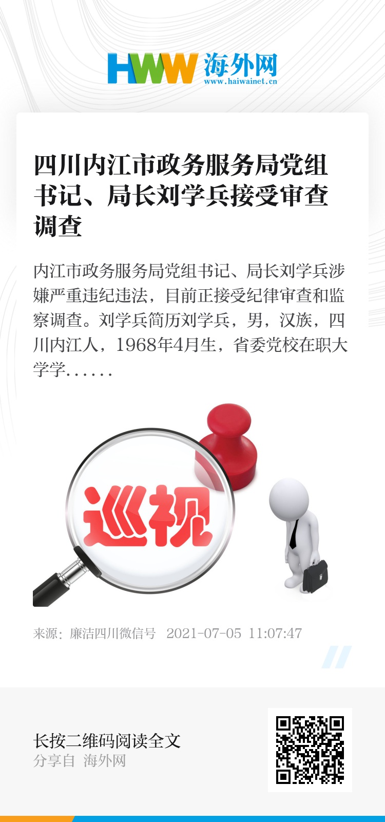 内江市政务服务局党组书记、局长刘学兵涉嫌严重违纪违法,目前正接受纪律审查和监察调查。