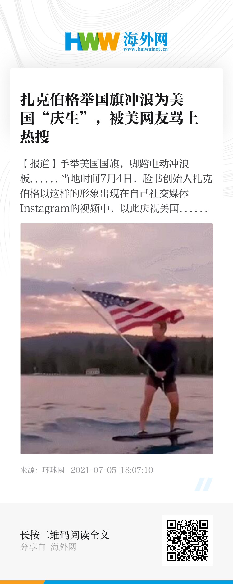 【环球网报道】手举美国国旗,脚踏电动冲浪板......当地时间7月4日,脸书创始人扎克伯格以这样的形象出现在自己社交媒体Instagram的视频中,以此庆祝美国独立日的到来。