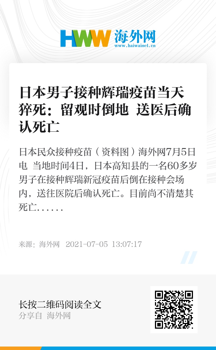 海外网7月5日电 当地时间4日,日本高知县的一名60多岁男子在接种辉瑞新冠疫苗后倒在接种会场内,送往医院后确认死亡。目前尚不清楚其死亡是否与疫苗有关。