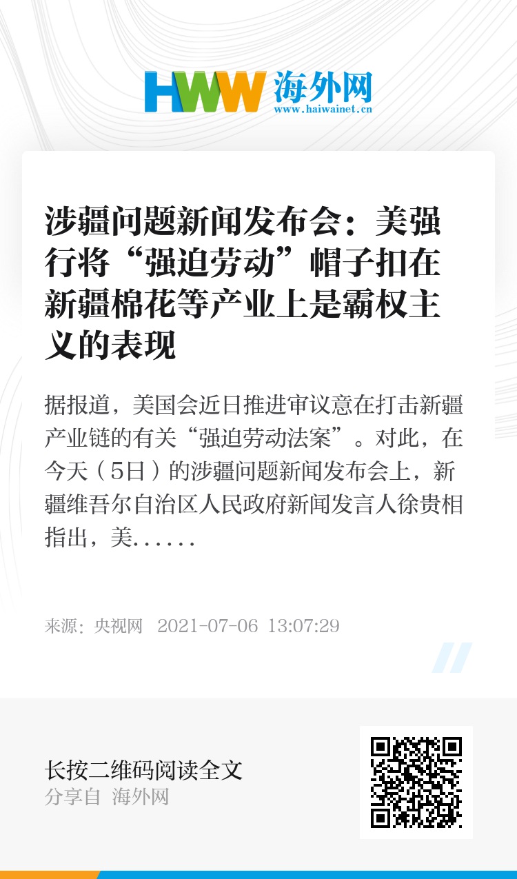 据报道,美国会近日推进审议意在打击新疆产业链的有关“强迫劳动法案”。对此,在今天(5日)的涉疆问题新闻发布会上,新疆维吾尔自治区人民政府新闻发言人徐贵相指出,美西方反华势力为了达到“以疆制华”目的,强行将“强迫劳动”的帽子扣在新疆棉花、纺织服装、光伏、番茄产业上,以不正当的手段维护其相关领域在“全球产业价值链”中的地位,这是霸权主义和强权政治的表现。